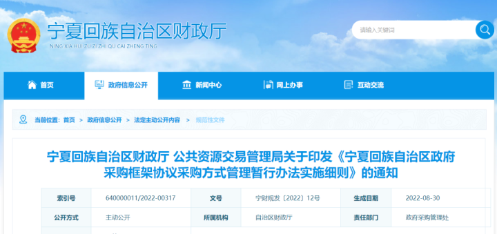 8月30日,宁夏财政厅结合自身条件,印发了《宁夏回族自治区政府采购框架协议采购方式管理暂行办法实施细则》的通知(以下简称《细则》)。