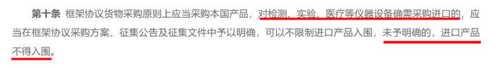 《细则》明确:框架协议货物采购原则上应当采购本国产品,对检测、实验、医疗等仪器设备确需采购进口的,应当在框架协议采购方案、征集公告及征集文件中予以明确,可以不限制进口产品入围,未予明确的,进口产品不得入围。