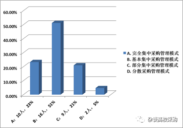 通过对全国各地共43所公立医院从事采购管理工作的人员就所在医院的采购管理模式进行调研,数据如下图1,可以看到,绝大部分医院都采用了集中采购管理模式,但更多偏向于基本集中采购管理模式。