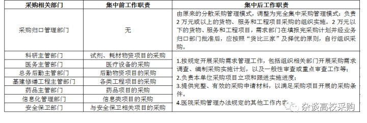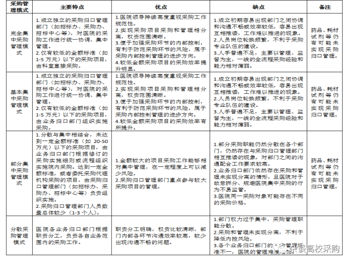 完全集中采购管理模式:成立专门的招标采购部门(如招标中心、采购办等),对医院的采购工作进行统一协调、集中管理、统一组织采购活动。对于较低金额(如1—5万元以下)的采购项目,由科室自行采购(不需要经过业务主管部门)。