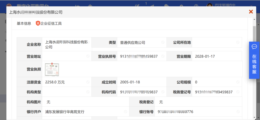 学校网络信息中心对教育部“高校数据共享应用平台”的“市场监管总局_企业基本信息查询接口”等按照采购业务需求组合封装成企业基本信息查询接口。在“数字化采购平台”的供应商管理模块,通过供应商名称和统一社会信用代码获取合格供应商基础信息(图1),如企业类型、法定代表人、经营期限、经营范围、注册资本等。