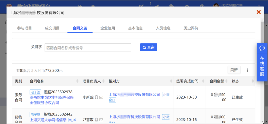 一是委托代理的项目在发布公告后,代理公司可以在代理平台的报名阶段调取上述入库的供应商信息(图3);二是由项目单位自行组织采购的线下比选项目,项目单位在采购执行过程中可以直接调取入库供应商信息(图4);三是参与采购项目的供应商,可通过供应商管理模块查看其活动轨迹,如供应商参与项目、成交项目、合同义务、企业信用、备案人员、历史评价等(图5-8);四是供应商标签页中历史评价实现了与其他高校供应商评价数据的共享。