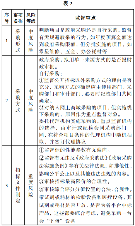 项目是政府采购还是自行采购,采用什么方式采购,代理机构的选择,采购现场的监督等等,这些环节的风险等级不一样,监督的侧重点也不一样。具体详见表2。