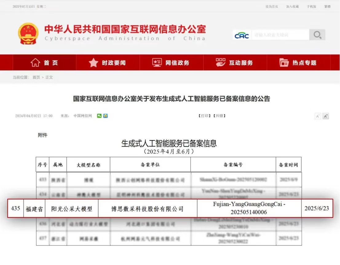 近日,国家互联网信息办公室发布公告,博思数采科技股份有限公司(数采科技)自主研发的“阳光公采大模型”正式完成了生成式人工智能服务备案。继2024年6月其核心算法完成深度合成服务算法备案后,数采科技已在公共采购领域率先完成了“算法+大模型”双备案。这不仅是数采科技技术创新道路上的重要里程碑,更能助力我国公共采购行业迈入数字化、智能化新阶段。